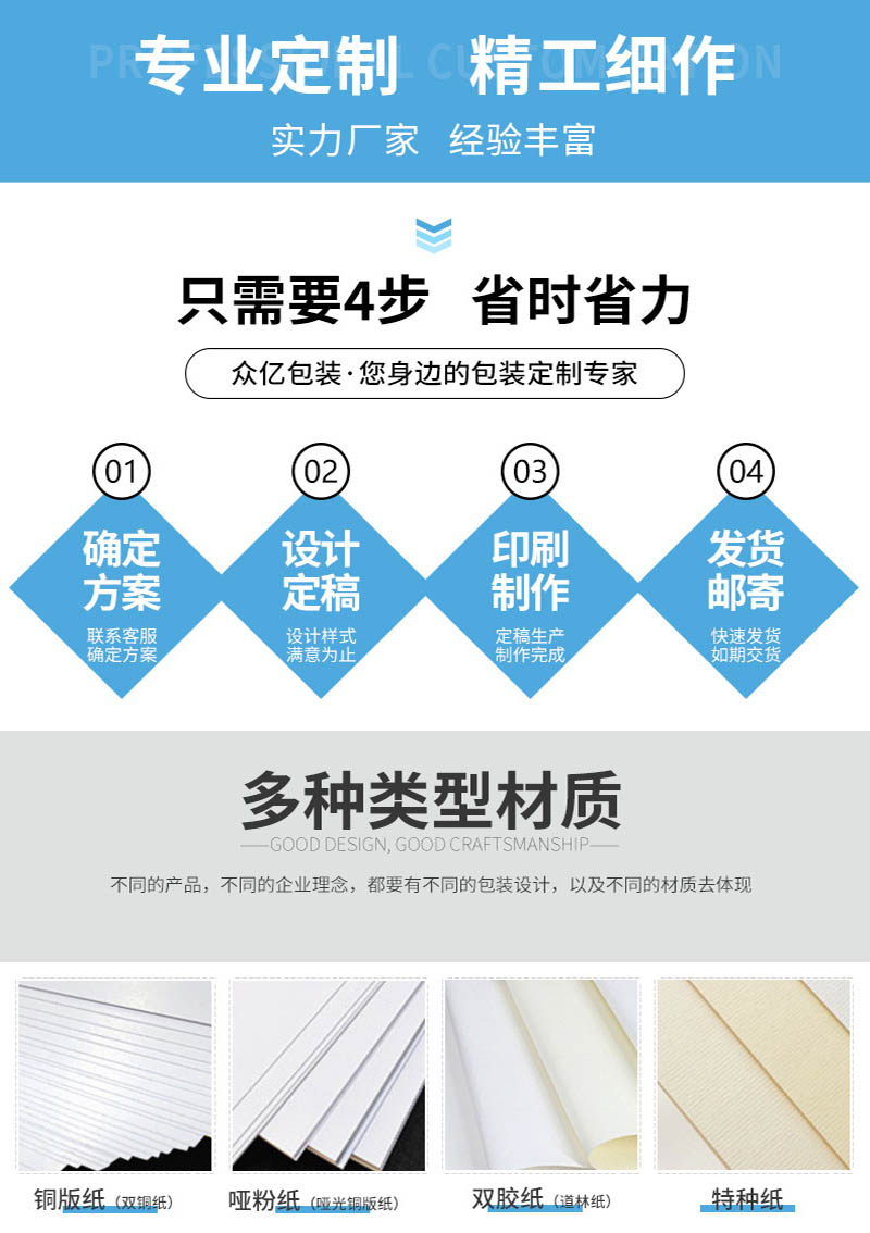 印刷紙張:銅版紙、雙膠紙、啞粉紙、珠光紙、其他藝術(shù)紙(藝術(shù)紙種類較多我們可以免費(fèi)提供紙樣供您選擇)