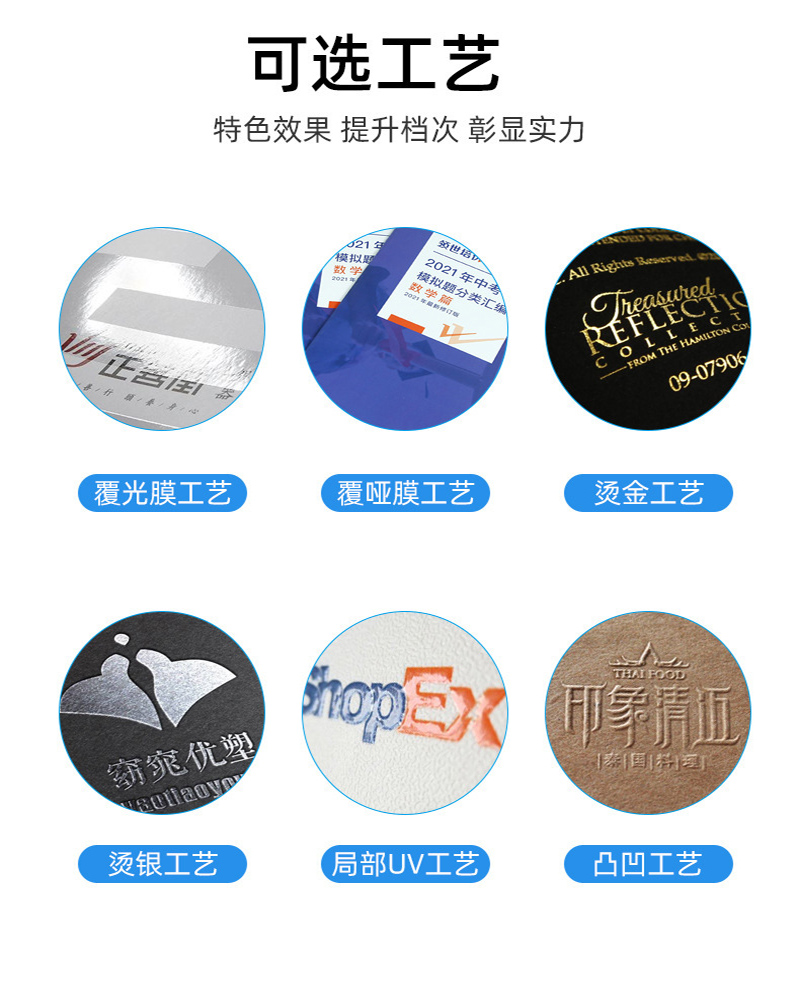 印刷紙張:銅版紙、雙膠紙、啞粉紙、珠光紙、其他藝術(shù)紙(藝術(shù)紙種類較多我們可以免費(fèi)提供紙樣供您選擇)